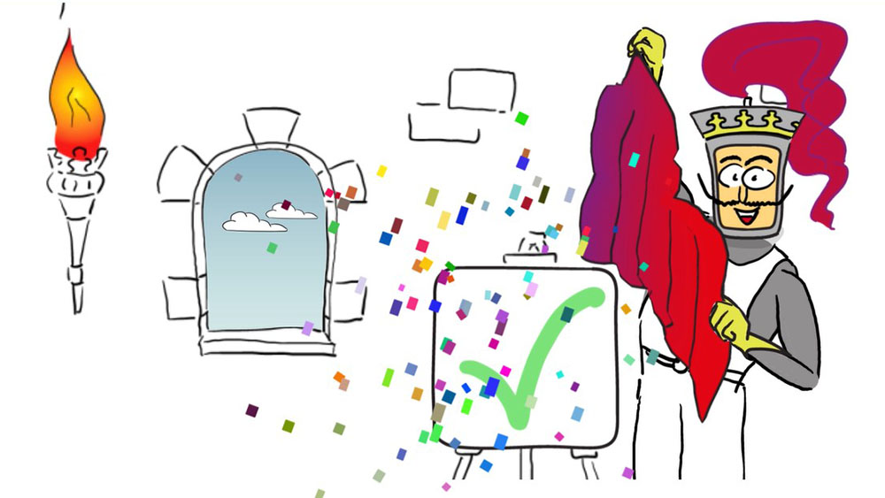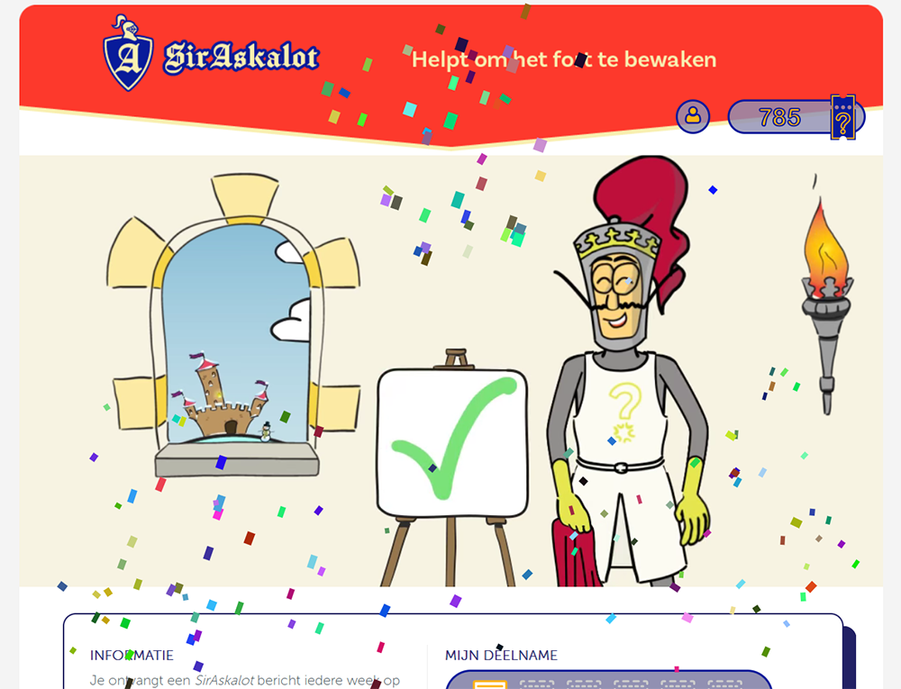 Sybren vertelt: We willen onze deelnemers iedere keer een vraag voorleggen en vervolgens hun antwoord beoordelen. Wie is hiervoor een beter karakter dan de klunzige Sir Askalot. De Ridder die beweert dat hij net deze vraag even niet weet. Als je een betweter bent, kan het er maar beter dik bovenop liggen.