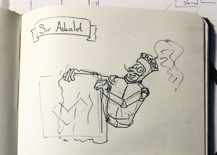 Sybren vertelt: We willen onze deelnemers iedere keer een vraag voorleggen en vervolgens hun antwoord beoordelen. Wie is hiervoor een beter karakter dan de klunzige Sir Askalot. De Ridder die beweert dat hij net deze vraag even niet weet. Als je een betweter bent, kan het er maar beter dik bovenop liggen.